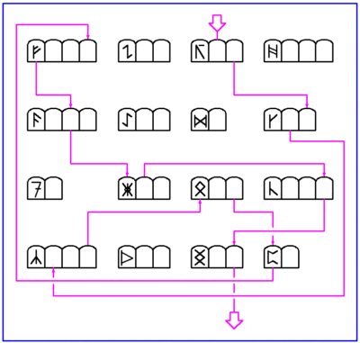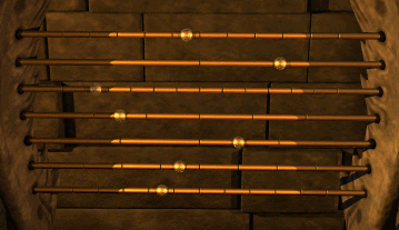 Ich stelle nun in den unteren Reihen das aktuelle Datum ein. Ein Blick in die Kristallkugel zeigt mir, dass Stonehenge heil ist. Als Maglor noch in seinem Gemach weilte, vertraute er mir an, dass das Ritual in 2 Tagen zur 6. Stunde der Nacht durchgeführt werden soll. Die oberste Stange hat 12 Unterteilungen, man kann sich leicht vorstellen, dass damit Stunden gemeint sind. Die zweite Stange von oben hat nur zwei Unterteilungen, das entspricht Tag und Nacht. Die dritte Stange von oben hat 14 Unterteilungen und steht für Wochentage. Da das Ritual in zwei Tagen stattfinden soll, muss ich in der dritten Stange die Kugeln um zwei Tage vorschieben. Die zweite Stange von oben bleibt auf Nacht, also Raster 2. Die Markierung der obersten Stange wird auf die 6. Stunde gerückt.
