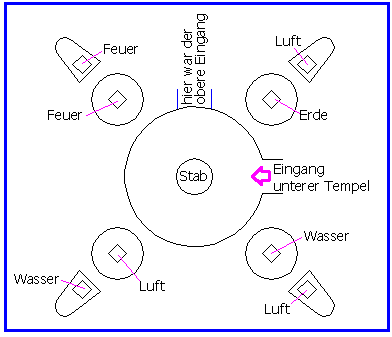 Die Lage der Elemente (Feuer, Luft, Wasser und Erde) ist die gleiche, wie im oberen Teil des Tempels. Das bedeutet, das Feuer im oberen sowie im unteren Tempelbereich muss übereinanderliegen. Der Eingang des unteren Tempelbereiches ist allerdings um eine viertel Drehung verschoben. Das heißt, oben war der Eingang zwischen Feuer und Erde und hier unten ist er zwischen Erde und Wasser. Vom Eingang aus, gehe ich gegen den Urzeigersinn zu den einzelnen Räumen und verteile die Kacheln der Elemente Erde, Feuer, Luft und Wasser in die runden Podeste. (Ihr braucht das jetzt noch nicht zu tun. Damit jemand die Chance hat, es zu kapieren, erkläre ich es nur ziemlich ausführlich.)